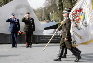 Lai apspriestu nemilitāro kravu tranzītu caur Latviju uz Afganistānu, trešdien un ceturtdien, 5. un 6.maijā, Latvijā darba vizītē uzturējās ASV Transporta pavēlniecības komandieris ģenerālis Dankans Dž.Maknabs. Vizītes laikā viesis tikās ar Latvijas augstākajām valsts un militārajām amatpersonām, kā arī kopā ar Aizsardzības ministrijas izpildsekretāru ģenerālmajoru Raimondu Graubi nolika ziedus pie pulkveža Oskara Kalpaka pieminekļa Rīgā (attēlā) Foto: Normunds Mežiņš, RJC |