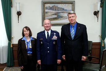 ASV Transporta pavēlniecības komandieris ģenerālis Dankans Dž.Maknabs un ASV vēstniece Latvijā Džūdita Gārbere, tiekoties ar Valsts prezidentu Valdi Zatleru Foto: VPK |