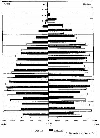 Iedzīvotāju dzimuma un vecumsastāvs 1995.g. un 2015.g. (inerces variants)