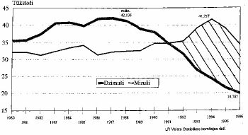 Iedzīvotāju dabiskais pieaugums Latvijā 1980.–1996.g.