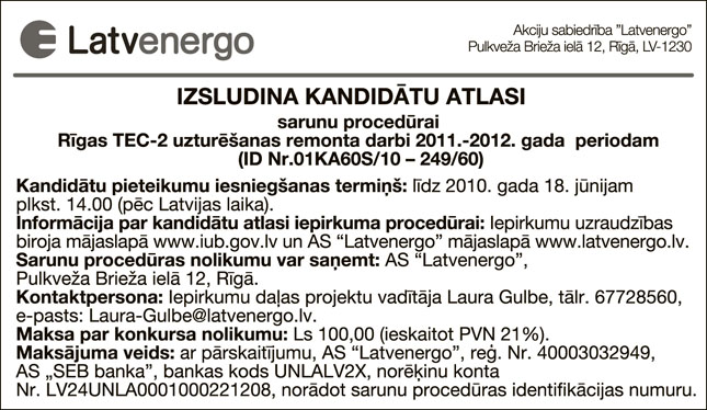 Piegādes un darbu izpildes pasūtījumi. Publicēts oficiālajā laikrakstā "Latvijas Vēstnesis", 12.05.2010., Nr. 74 https://www.vestnesis.lv/ta/id/209690