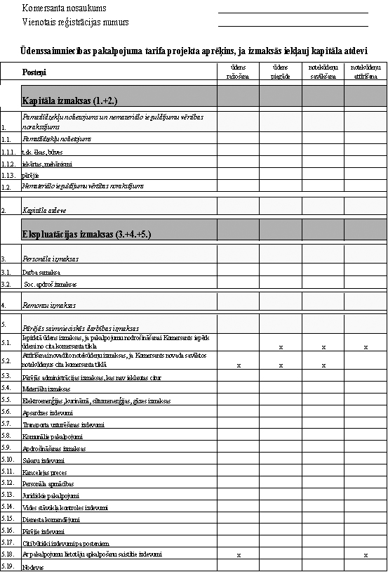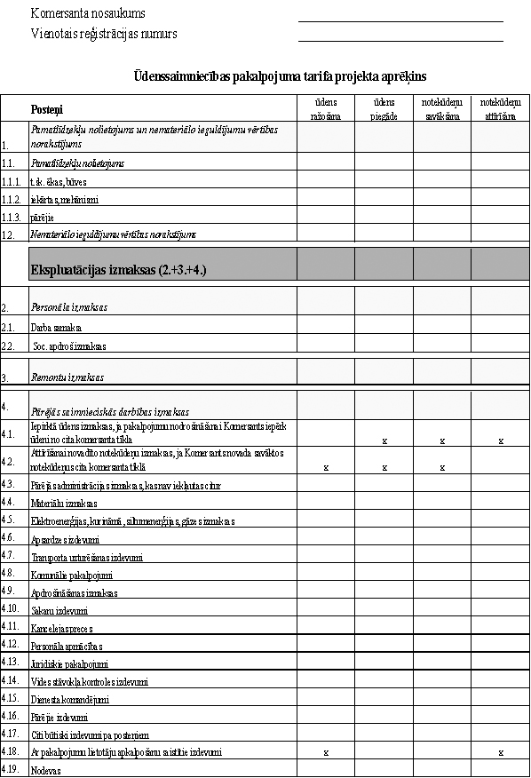 6. Ja Komersants sniedz vairākus ūdenssaimniecības pakalpojumu veidus, papildus atsevišķiem tarifu projektiem Komersants aprēķina arī attiecīgi ūdensapgādes pakalpojumu tarifa projektuun kanalizācijas pakalpojumu tarifa projektu vai tikai ūdensapgādes pakalpojumu tarifa projektu vai kanalizācijas pakalpojumu tarifa projektu.