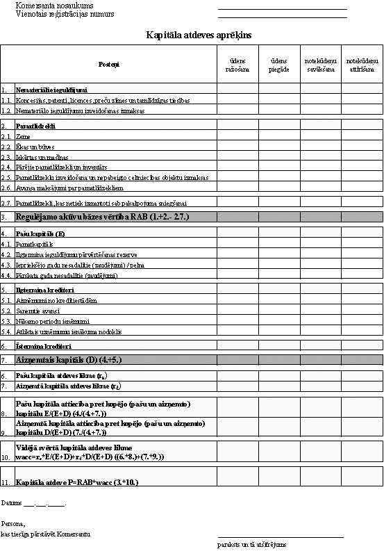 44. Komersants, kurš tarifa projektā iekļauj kapitāla atdevi, pirms tarifa projekta iesniegšanas iesniedz Regulatoram lūgumu noteikt vidējo svērto kapitāla atdeves likmi un Regulators pēc visas nepieciešamās informācijas saņemšanas nosaka vidējo svērto kapitāla atdeves likmi.