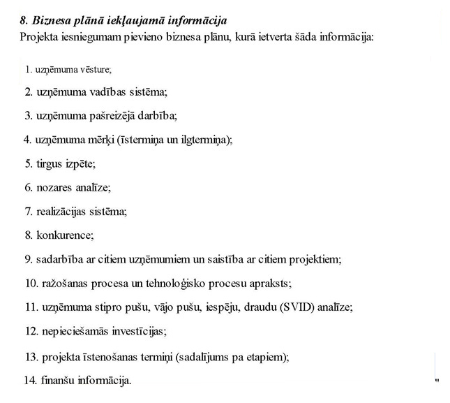 "9.2. kas apliecina uzņēmuma ekonomisko dzīvotspēju. Ekonomiskās dzīvotspējas rādītājs ir pozitīva naudas plūsma projekta iesnieguma iesniegšanas gadā, visos tā īstenošanas gados un gadā pēc projekta īstenošanas. Naudas plūsmā naudas atlikums katra mēneša beigās ir pozitīvs. Gadā pēc projekta īstenošanas salīdzinājumā ar projekta iesnieguma iesniegšanas gadu ienākumi no lauksaimniecības produkcijas pārstrādes palielinās vismaz par 3 % vai izdevumi samazinās par 3 %. Projekta iesniegumam pievienotais pārskats par naudas plūsmu projekta iesnieguma iesniegšanas gadā, visos īstenošanas gados un gadā pēc projekta īstenošanas apliecina iespēju ieviest projektu un sasniegt mērķi."