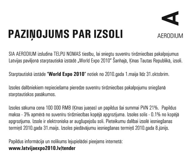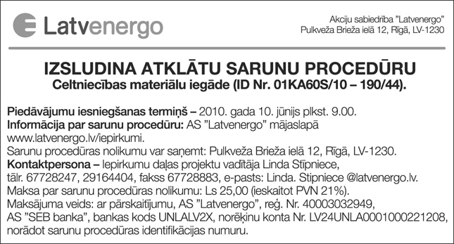 A/s „Pasažieru vilciens” izsludina atklātu konkursu par darbinieku veselības apdrošināšanu. Piedāvājuma iesniegšanas termiņš: līdz 2010.gada 8.jūnija plkst.10. Konkursa nolikumu var saņemt darbdienās no plkst.8 līdz 17 a/s „Pasažieru vilciens” Juridiskajā daļā - 104.kabinetā, Turgeņeva ielā 14, Rīgā, tālr. +371-67233513. Kontaktpersona: a/s „Pasažieru vilciens” Personāla daļas vadītāja Ilma Zālīte, tālr.+371-67234389.