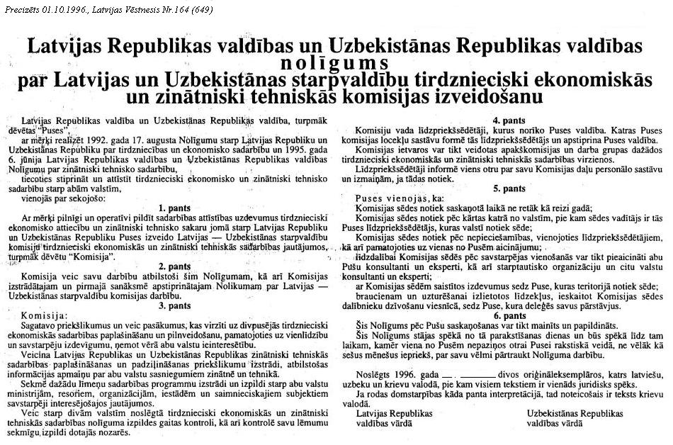 Latvijas Republikas valdības un Uzbekistānas Republikas valdības nolīgums par Latvijas un Uzbekistānas starpvaldību tirdznieciski ekonomiskās un zinātniski tehniskās komisijas izveidošanu. Publicēts oficiālajā laikrakstā "Latvijas Vēstnesis", 27.09.1996., Nr. 162/163 https://www.vestnesis.lv/ta/id/211043