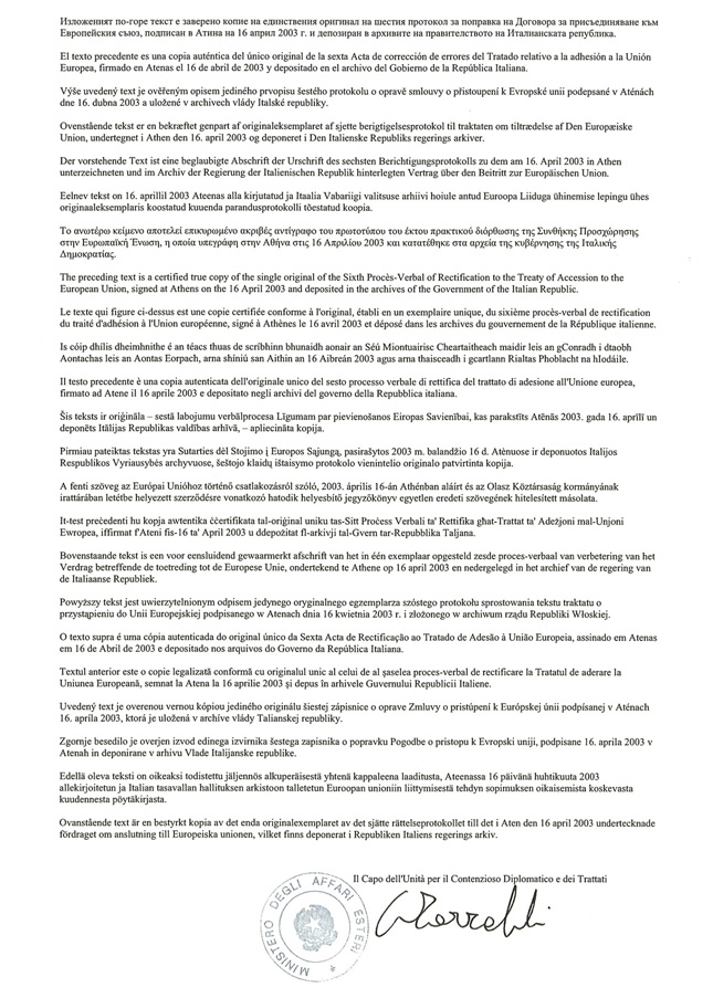 1. Piekto un Sesto labojumu verbālprocesu Līgumam starp Beļģijas Karalisti, Dānijas Karalisti, Vācijas Federatīvo Republiku, Grieķijas Republiku, Spānijas Karalisti, Francijas Republiku, Īriju, Itālijas Republiku, Luksemburgas Lielhercogisti, Nīderlandes Karalisti, Austrijas Republiku, Portugāles Republiku, Somijas Republiku, Zviedrijas Karalisti, Lielbritānijas un Ziemeļīrijas Apvienoto Karalisti (Eiropas Savienības dalībvalstīm) un Čehijas Republiku, Igaunijas Republiku, Kipras Republiku, Latvijas Republiku, Lietuvas Republiku, Ungārijas Republiku, Maltas Republiku, Polijas Republiku, Slovēnijas Republiku, Slovākijas Republiku par Čehijas Republikas, Igaunijas Republikas, Kipras Republikas, Latvijas Republikas, Lietuvas Republikas, Ungārijas Republikas, Maltas Republikas, Polijas Republikas, Slovēnijas Republikas, Slovākijas Republikas pievienošanos Eiropas Savienībai.