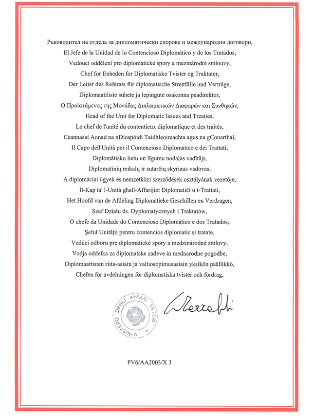 Съставено в Рим на двадесет и трети март две хиляди и десета година.