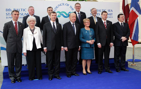 Lai apspriestu Baltijas jūras nākotni, kā arī situāciju Baltijas reģionā, otrdien, 1.jūnijā, Lietuvas galvaspilsētā Viļņā tikās Baltijas jūras valstu valdību vadītāji un pārstāvji. Šeit attēlā (1.rindā no labās) Eiropas Komisijas prezidents Žozē Manuels Barrozu, Latvijas Ministru prezidents Valdis Dombrovskis, Zviedrijas vicepremjere un uzņēmējdarbības, enerģētikas un komunikācijas ministre Mauda Olofsone, Lietuvas premjerministrs Andrjus Kubiļus, Igaunijas premjerministrs Andruss Ansips, Īslandes premjerministre Johana Sigurdardotīra, Norvēģijas premjerministrs Jens Stoltenbergs; (2.rindā no labās) Vācijas Ārlietu ministrijas valsts ministrs Verners Hoijers, Somijas premjerministrs Mati Vanhanens, Polijas ārlietu ministrs Radoslavs Sikorskis un Krievijas ārlietu ministra vietnieks Vladimirs Titovs Foto: Valda Kalniņa, A.F.I. |