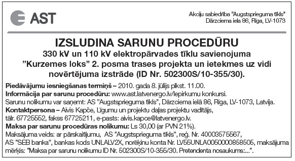 Piedāvājumu iesniegšanas termiņš - 2010. gada 28. jūnijs plkst. 10 AS “Latvijas valsts meži” telpās Rīgā, Kristapa ielā 30.
