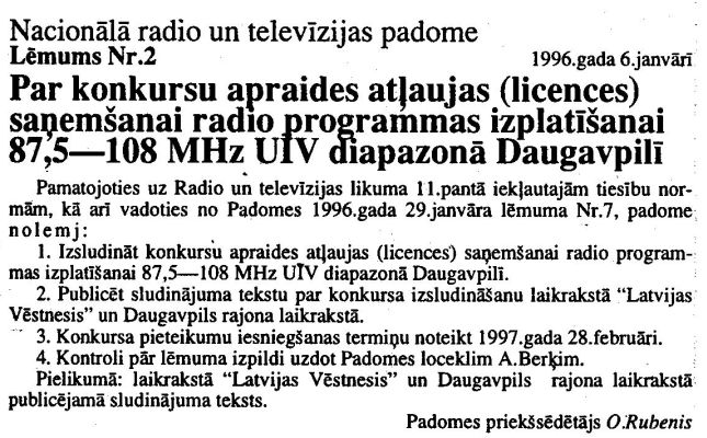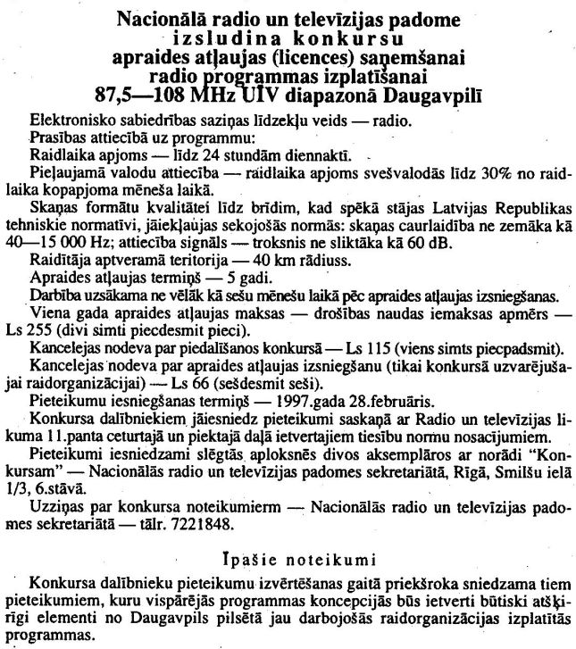 Par konkursu apraides atļaujas (licences) saņemšanai radio programmas izplatīšanai 87,5-108 MHz UĪV diapazonā Daugavpilī. Publicēts oficiālajā laikrakstā "Latvijas Vēstnesis", 14.01.1997., Nr. 12/13/14/15 https://www.vestnesis.lv/ta/id/211940