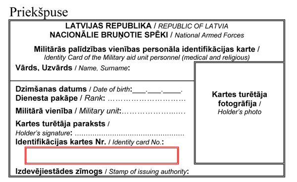 3.1. militārās palīdzības vienības personāla identifikācijas kartes (1.pielikums) un rokas apsējus (2.pielikums) Nacionālo bruņoto spēku ārstniecības personām un Nacionālo bruņoto spēku kapelāniem, kuri norīkoti tikai medicīniskas palīdzības sniegšanai vai garīgas aprūpes veikšanai bruņota konflikta rajonā;