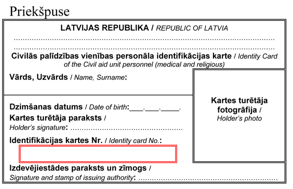 3.5. civilās palīdzības vienības personāla identifikācijas kartes (3.pielikums) un rokas apsējus Latvijas Republikā oficiāli atzīto palīdzības biedrību personālam, kuram atļauts ar savām palīdzības vienībām palīdzēt ārvalstij, kurā notiek bruņots konflikts, ja minētā ārvalsts akceptē šo palīdzību, pirms minētais palīdzības biedrības personāls izbrauc no Latvijas Republikas;