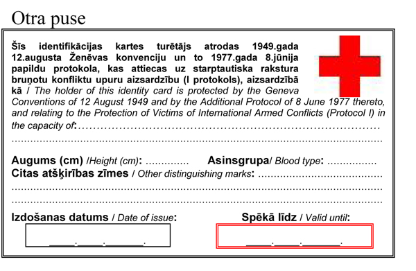 8.1. izsniedz identifikācijas kartes un rokas apsējus personām, kurām ir tiesības uz Ženēvas konvencijās noteikto aizsardzību;