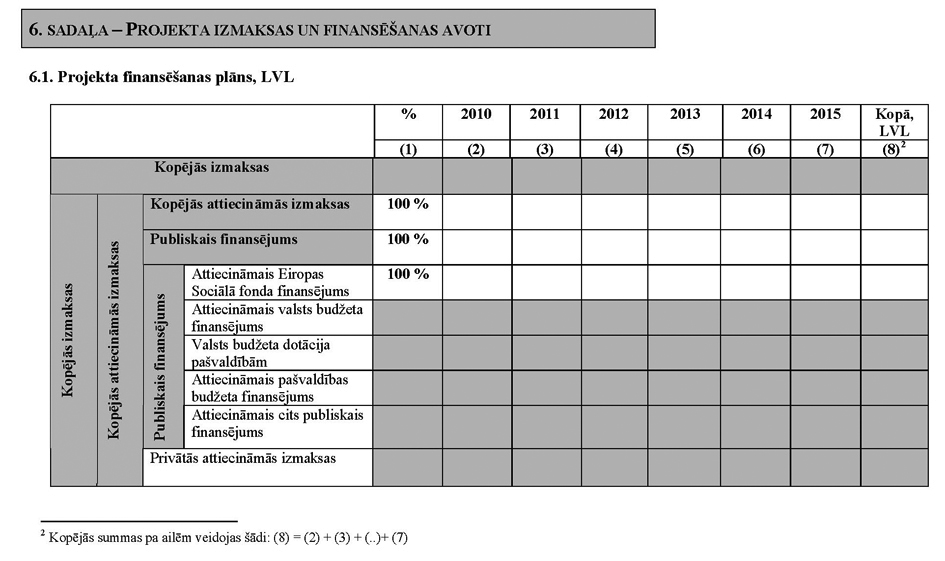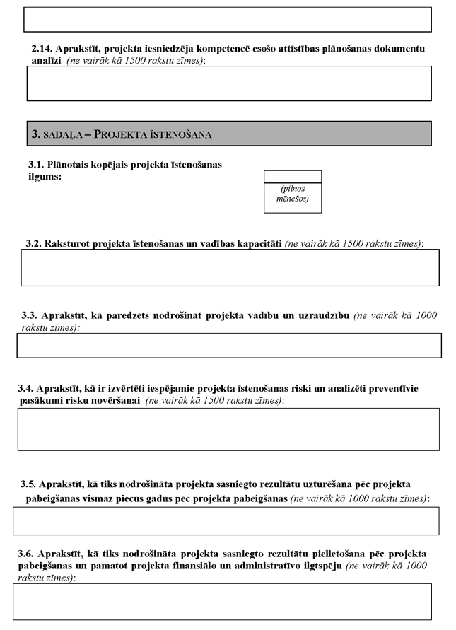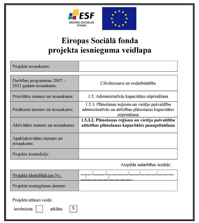 | 6. | Projekta iesnieguma veidlapa ir pilnībā aizpildīta un sagatavota atbilstoši Ministru kabineta 2010.gada 8.jūnija noteikumu Nr.522 "Noteikumi par darbības programmas "Cilvēkresursi un nodarbinātība" papildinājuma 1.5.3.2.aktivitāti "Plānošanas reģionu un vietējo pašvaldību attīstības plānošanas kapacitātes paaugstināšana"" (turpmāk – noteikumi) 1.pielikumā noteiktajām prasībām |