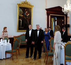 Otrdien, 29.jūnijā, ar svinīgo sagaidīšanas ceremoniju pie Rīgas pils sākās Slovēnijas Republikas prezidenta Danilo Turka un viņa kundzes Barbaras Mikličas-Turkas divu dienu oficiālā vizīte Latvijas Republikā. Vizītes pirmajā dienā Rīgas pilī notika abu prezidentu divpusējā tikšanās un valstu delegāciju sarunas. Kopīgajā preses konferencē prezidenti sniedza ieskatu sarunās skartajos jautājumos, kā arī atbildēja uz žurnālistu jautājumiem (skat. “LV” Nr.102, 30.06.2010). Pēcpusdienā augstais viesis nolika ziedus pie Brīvības pieminekļa, tikās ar Latvijas Ministru prezidentu Valdi Dombrovski, kopā ar Latvijas Valsts prezidentu piedalījās Latvijas un Slovēnijas biznesa forumā (skat. zemāk), kā arī apmeklēja Latvijas Okupācijas muzeju. Vizītes pirmā diena Danilo Turkam un Barbarai Mikličai-Turkai beidzās ar Latvijas Valsts prezidenta Valda Zatlera un Lilitas Zatleres rīkotajām oficiālajām vakariņām Melngalvju namā (attēlā). Vizītes otrā diena sākās ar augstā viesa vizīti Saeimā un tikšanos ar Saeimas priekšsēdētāja pienākumu izpildītāju Solvitu Āboltiņu, sekoja tikšanās ar Rīgas domes priekšsēdētāju Nilu Ušakovu. Pēcpusdienā ciemiņi viesojās prezidenta Jūrmalas rezidencē, no kurienes devās uz vienu no Latvijas lepnumiem – Rundāles pili Foto: VPK |