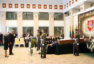 Pirmais atjaunotās neatkarīgās Latvijas Republikas Valsts prezidents Guntis Ulmanis Lietuvas prezidenta pils Kolonnu zālē, atvadoties no sava bijušā kolēģa un drauga – pirmā tieši ievēlētā atjaunotās Lietuvas Republikas prezidenta Aļģirda Brazauska (apakšējā attēlā pa kreisi); tagadējais Latvijas Valsts prezidents Valdis Zatlers, izsakot līdzjūtību Aļģirda Brazauska tuviniekiem (apakšējā attēlā pa labi) Foto: VPK |