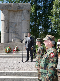 Valsts prezidenta darba vizīte turpinājās ar V.Zatlera dalību tēlnieka Kārļa Zāles veidotā pieminekļa Brīvības cīņās (1914–1920) kritušajiem 80.gadadienas pasākumos, kas iesākās ar aizlūgumu Jaunpiebalgas Svētā Toma evaņģēliski luteriskajā baznīcā. Pēc ziedu nolikšanas pie atjaunotā pieminekļa V.Zatlers uzrunāja klātesošos (attēlā pa labi): “Pēc astoņdesmit gadiem mēs lasām uz pieminekļa vārdus – “Mūžam nerims varoņu gars” – lai sajustu to dzimtenes mīlestību, ticību Latvijas valstij, par kuras vārdu mūsu senči atdeva savu dzīvību. Šī ir mūsu zeme – viņi to mums ir novēlējuši”. Pievēršoties brīvības tēmai, viņš uzsvēra: lai arī šobrīd brīvība liekas pašsaprotama, dažkārt dažiem pat kā slogs, tomēr “tā ir jānes ar darbu, pašapziņu un dzimtenes mīlestību. To dienu varoņu gars jāatrod katrā no mums”. Pēc svinīgās ceremonijas Valsts prezidents un dzīvesbiedre iestādīja ozoliņu.