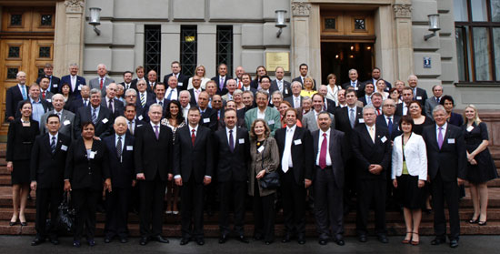 Ministru prezidents Valdis Dombrovskis (pirmajā rindā piektais no kreisās) un Ārlietu ministrijas valsts sekretārs Andris Teikmanis (pirmajā rindā ceturtais no kreisās) vakar, 8.jūlijā, kopā ar Latvijas goda konsuliem pie Ārlietu ministrijas nama Latvijas Ārlietu ministrijas foto |