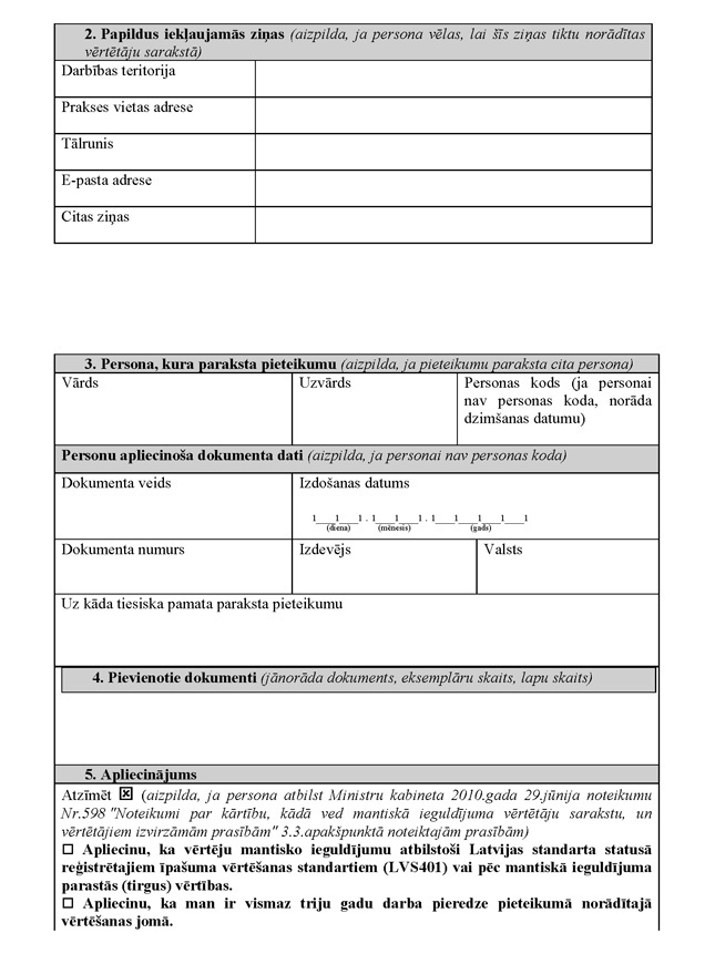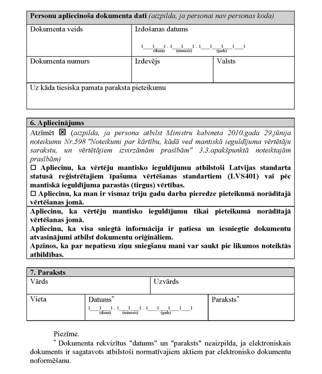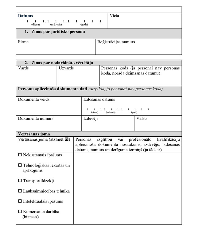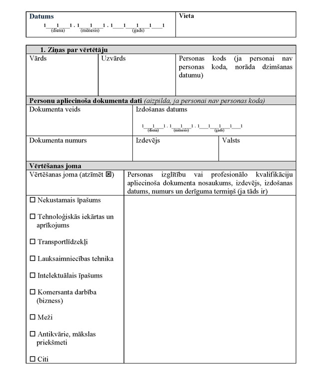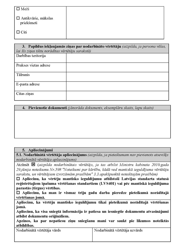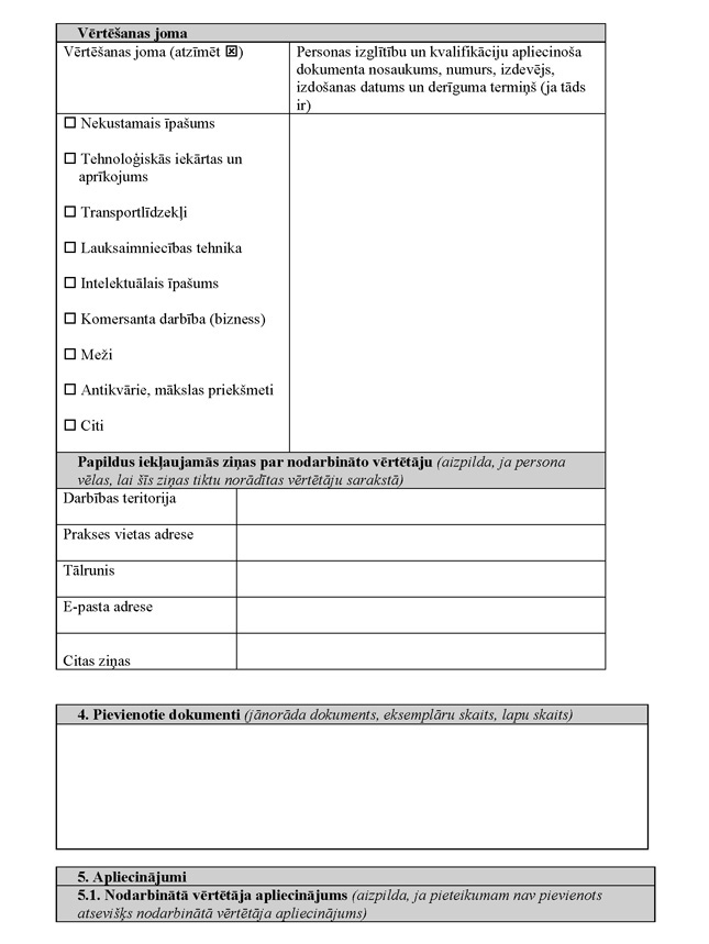 Pieteikums fiziskas personas iekļaušanai mantiskā ieguldījuma vērtētāju sarakstā