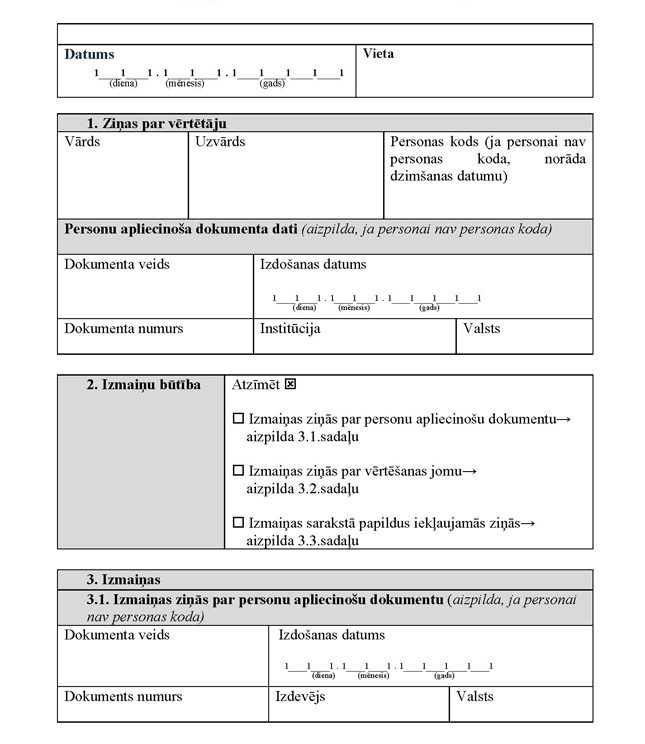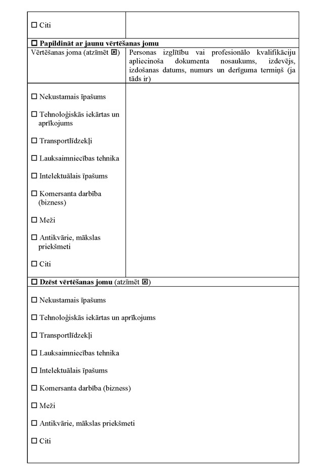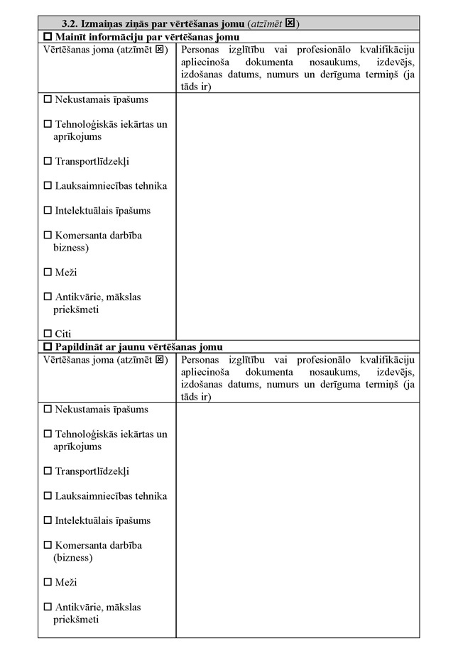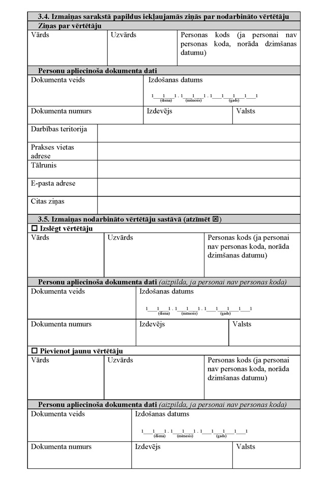 Pieteikums par izmaiņām ziņās, kas norādītas mantiskā ieguldījuma vērtētāju sarakstā par fizisku personu
