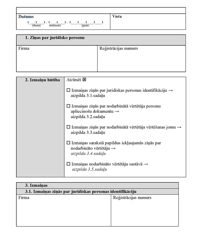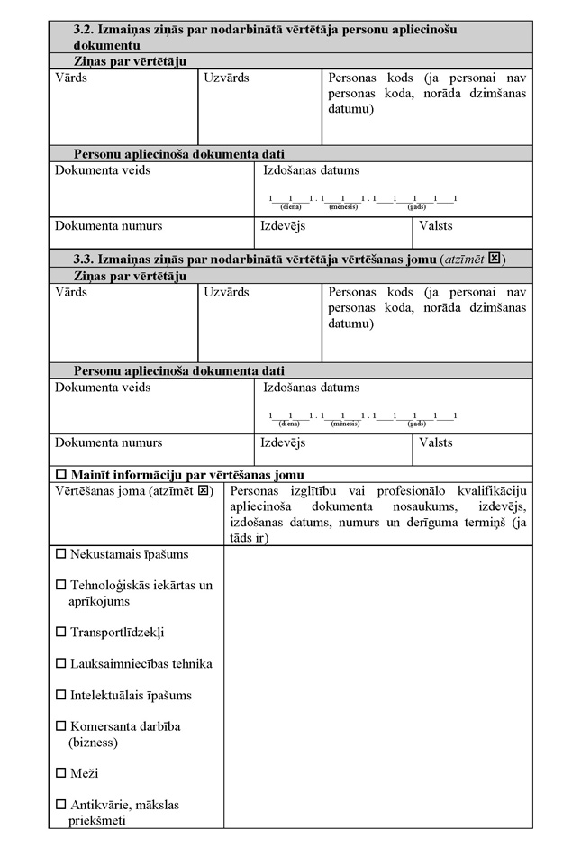 Pieteikums par izmaiņām ziņās, kas norādītas mantiskā ieguldījuma vērtētāju sarakstā par juridisku personu