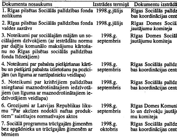 Uzdot Rīgas Domes Sociālo jautājumu komitejai, Rīgas Sociālās palīdzības koordinācijas centram un Rīgas Domes Komunālo un dzīvokļu jautājumu komitejai sagatavot un iesniegt apstiprināšanai koncepcijas 4. sadaļā minēto normatīvo dokumentu projektus.4.