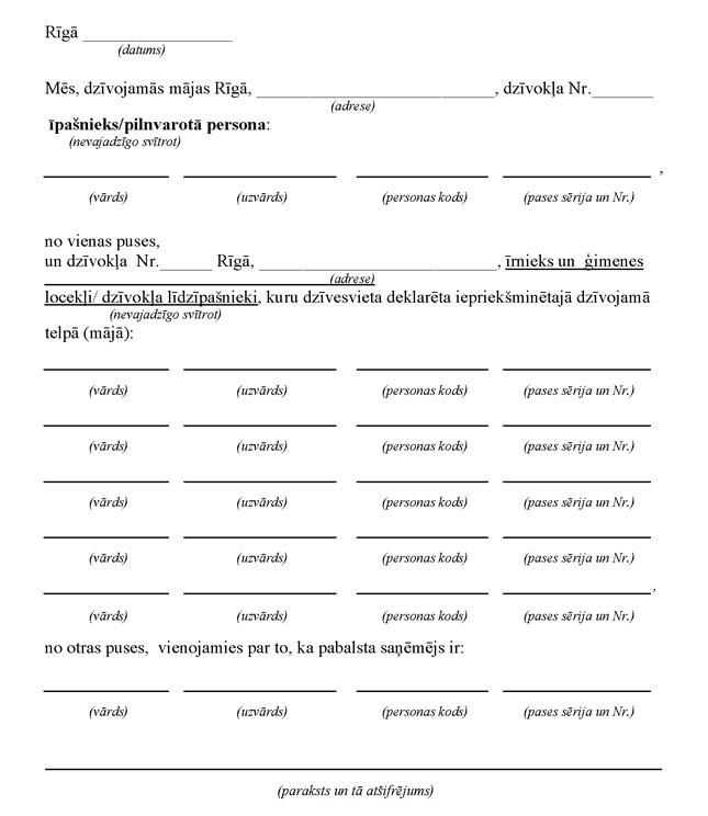 14.1. Departamenta speciālista klātbūtnē parakstītu vienošanos, kas noslēgta starp atjaunojamās vai cietušās dzīvojamās telpas īpašnieku un/vai īrnieku un šajā dzīvoklī uz tiesiska pamata deklarētām pilngadīgām personām vai starp dzīvokļa kopīpašniekiem par to, kurš kļūs par pabalsta saņēmēju (pielikums);
