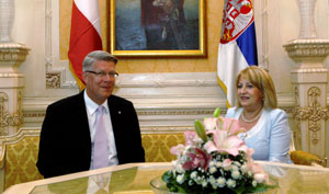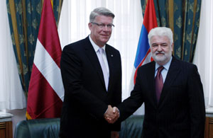 Latvijas Republikas Valsts prezidents Valdis Zatlers pirmdien, 12.jūlijā, devās uz Serbiju, kur otrdien, 13.jūlija rītā, ar oficiālo sagaidīšanas ceremoniju pie pils “Serbia” galvaspilsētā Belgradā sākās valstsvizīte. Valstsvizītes ietvaros Valdis Zatlers tikās ar Serbijas prezidentu Borisu Tadiču, premjerministru Mirko Cvetkoviču, Nacionālās asamblejas priekšsēdētāju Slavicu Dukiču-Dejanoviču, kā arī piedalījās Serbijas un Latvijas biznesa forumā. Savukārt vakar, 14.jūlija pēcpusdienā, Latvijas Valsts prezidents Valdis Zatlers no Serbijas devās valstsvizītē uz Maķedonijas Republiku, kur tikās ar Maķedonijas prezidentu Gjorgi Ivanovu, premjerministru Nikolu Grujevski un Maķedonijas Asamblejas prezidentu Tjarko Veljanovski (skat. “LV” nākamo laidienu). Latvijā Valsts prezidents atgriežas rīt, 16.jūlijā. Attēlā: Latvijas