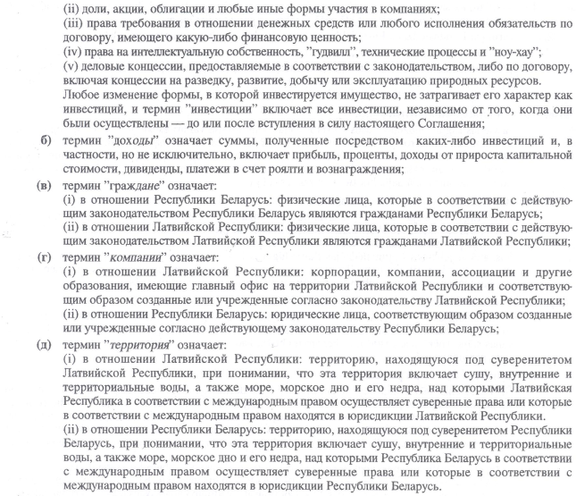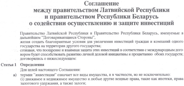 Соглашение между правительством Латвийской Республики и правительством Республики Беларусь о содействии осуществлению и защите инвестиций. Publicēts oficiālajā laikrakstā "Latvijas Vēstnesis", 2.07.1998., Nr. 194/195 https://www.vestnesis.lv/ta/id/213543