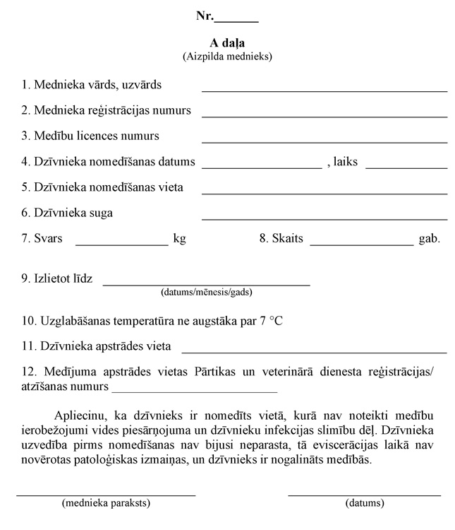 12. Pavaddokumentu aizpilda trijos eksemplāros. Vienu eksemplāru mednieks nodod galapatērētājam vai uzņēmumam, otru eksemplāru glabā apmācītā persona vai valsts pilnvarots veterinārārsts, trešais eksemplārs glabājas medījumu apstrādes vietā. Pavaddokumentu glabā trīs gadus.