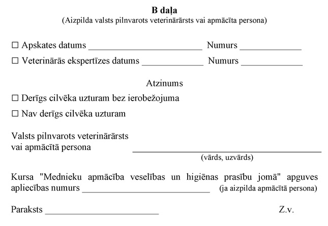 3.5. pret trihinelozes ierosinātāju uzņēmīgu medījamo dzīvnieku (mežacūku, nepārnadžu) gaļa ir izmeklēta laboratorijā, kas akreditēta sabiedrības ar ierobežotu atbildību "Standartizācijas, akreditācijas un metroloģijas centrs" Latvijas Nacionālajā akreditācijas birojā atbilstoši standartam LVS EN ISO/IEC 17025:2005 "Testēšanas un kalibrēšanas laboratoriju kompetences vispārīgās prasības", un izmeklējumu rezultāti liecina, ka gaļā nav konstatēta trihinelozes ierosinātāja klātbūtne.