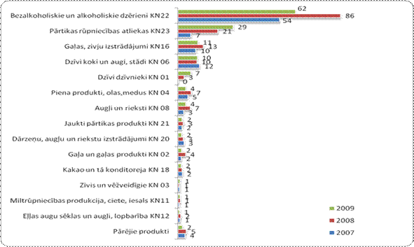Nozīmīgākie KF importa produkti 2009.gadā Latvijā bija alkoholiskie un bezalkoholiskie dzērieni (47 % no KF importa Latvijā) un pārtikas rūpniecības atliekas (cietes ražošanas atlikumi; augu tauku vai eļļu ekstrakcijas rezultātā iegūtie rauši un citi atlikumi; 21 % no KF importa Latvijā).