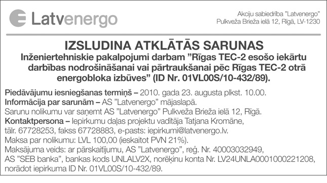 Piedāvājumu iesniegšanas termiņš: 2010.gada 23.augusts līdz plkst. 14.00.