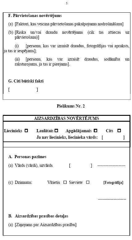 (10) Kad Reģistrētājs nolemj, ka papildus šeit minētajiem sniedzamajiem Pārvietošanas pakalpojumiem Liecinieku un nepieciešamības gadījumā viņu tuvāko radinieku aizsardzībai nepieciešami arī aizsardzības pasākumi (turpmāk saukta: "Aizsardzības prasība"), attiecīgajam Pieprasījumam tiek pievienots ziņojums par Aizsardzības prasību. Šis ziņojums tiek sniegts šīs Vēstuļu apmaiņas Pielikumā Nr.2 norādītajā formā.