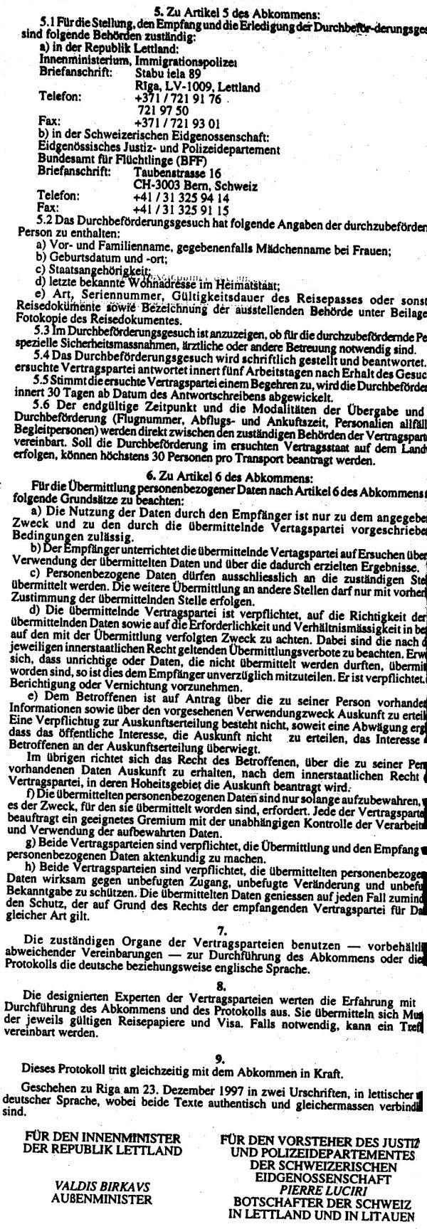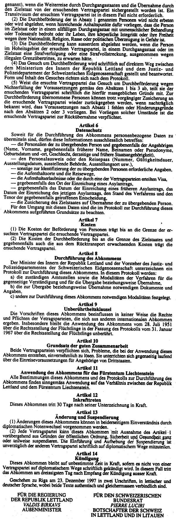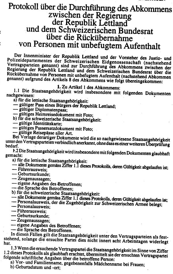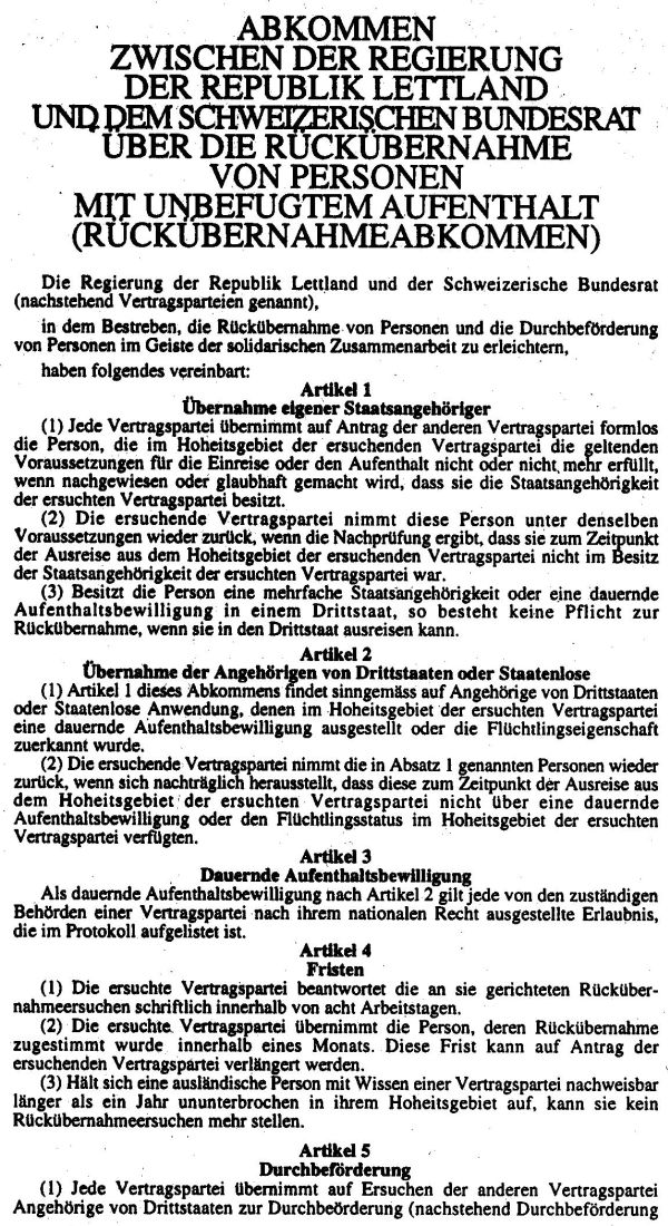 ABKOMMEN ZWISCHEN DER REGIERUND DER REPUBLIK LETTLAND UND DEM SCHWEIZERISCHEN BUNDESRAT UBER DIE RUCKUBERNAHME VON PERSONEN MIT UNBEFUGTEM AUFENTHALT (RUCKUBERNAHMEAMKOMMEN). Publicēts oficiālajā laikrakstā "Latvijas Vēstnesis", 8.01.1998., Nr. 6 https://www.vestnesis.lv/ta/id/214175