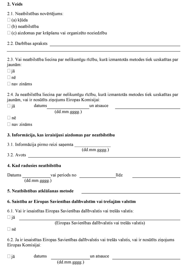 29. Ar neatbilstību šo noteikumu izpratnē saprot jebkuru fonda vadību reglamentējošā Latvijas Republikas vai Eiropas Savienības tiesību akta pārkāpumu, kurš radies vadošās iestādes, revīzijas iestādes, sertificēšanas iestādes, maksājumu iestādes vai finansējuma saņēmēja darbības vai bezdarbības dēļ un kuram ir vai varētu būt negatīva ietekme uz Eiropas Savienības vispārējo budžetu.