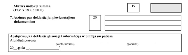 55.8 Dabasgāzes deklarācijā sniegtās informācijas un šo noteikumu 55.7 punktā minētās informācijas patiesumu ar parakstu (atšifrējot to) apstiprina akcīzes nodokļa maksātāja atbildīgā persona (amatpersona, kurai ir paraksta tiesības, vai tās pilnvarota persona) un norāda parakstīšanas datumu."