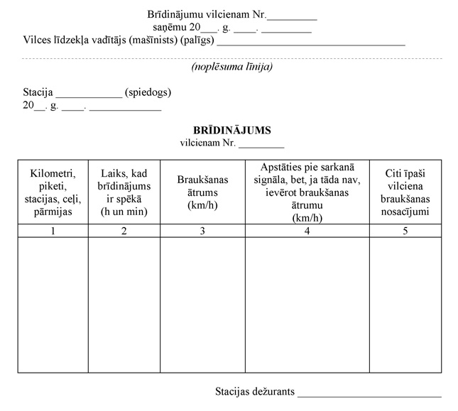 Brīdinājuma pieteikuma saņemšanas laiks, numurs. Atbildīgā persona, kura pārraidīja brīdinājumu, un stacijas dežuranta paraksts par pieņemšanu |