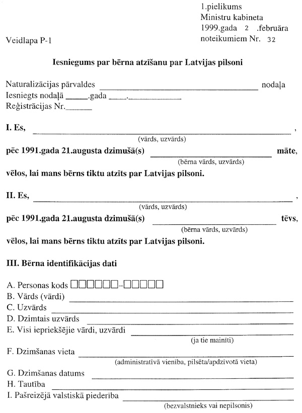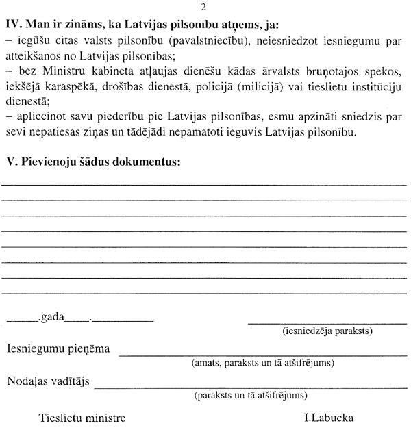 26. Līdz 1999.gada 31.decembrim šo noteikumu 11.1.apakšpunktā minēto dokumentu vietā var iesniegt bijušās PSRS pilsoņa pasi ar Iedzīvotāju reģistra atzīmi un atzīmi par pierakstu Latvijā, kam pievienojams rakstisks apliecinājums, ka iesniedzējs nav ieguvis citas valsts pilsonību (5.pielikums).