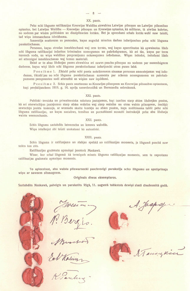 Šodien, 11.augustā, aprit 90 gadu, kopš parakstīts Latvijas–Krievijas Miera līgums, kurš sastāvēja no preambulas un 23 pantiem. Aizsardzības ministrs Imants Lieģis līguma 90.gadadienas sakarā norāda uz tā nozīmīgumu Latvijas attiecībās ar Krieviju.