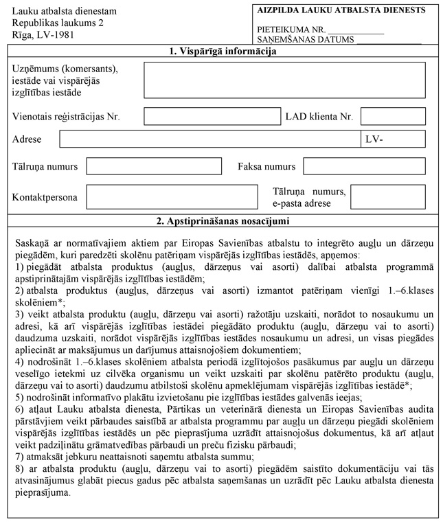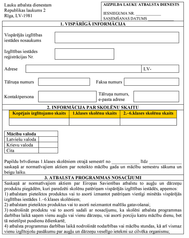 10. Vispārējās izglītības iestāde katru gadu līdz 15.septembrim iesniedz Lauku atbalsta dienestā iesniegumu (2.pielikums) dalībai atbalsta programmā kārtējā mācību gadā. Lauku atbalsta dienests savā mājaslapā internetā (www.lad.gov.lv) publicē to vispārējās izglītības iestāžu sarakstu, kuras piedalās atbalsta programmā.