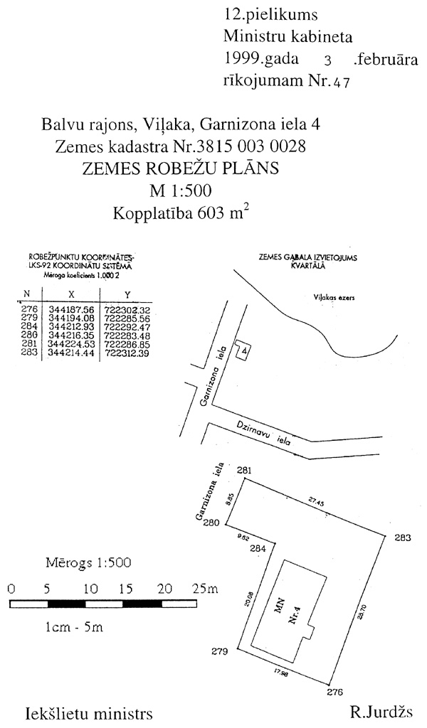 1.12. zemesgabalu 603 m2 platībā (zemes kadastra Nr. 3815 003 0028, zemesgabala robežas norādītas 12.pielikumā) Balvu rajona Viļakā, Garnizona ielā 4;