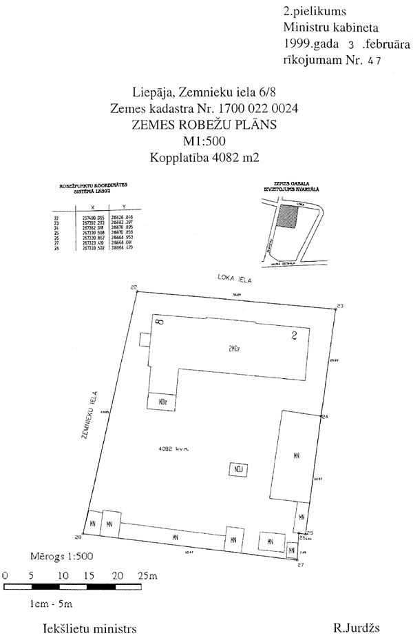 1.2. zemesgabalu 4082 m2 platībā (zemes kadastra Nr. 1700 022 0024, zemesgabala robežas norādītas 2.pielikumā) Liepājā, Zemnieku ielā 6/8;