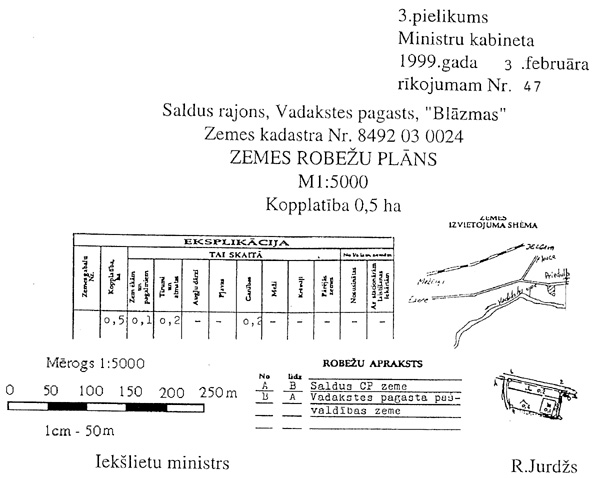 1.3. zemesgabalu 0,5 ha platībā (zemes kadastra Nr. 8492 03 0024, zemesgabala robežas norādītas 3.pielikumā) Saldus rajona Vadakstes pagasta Blāzmās;
