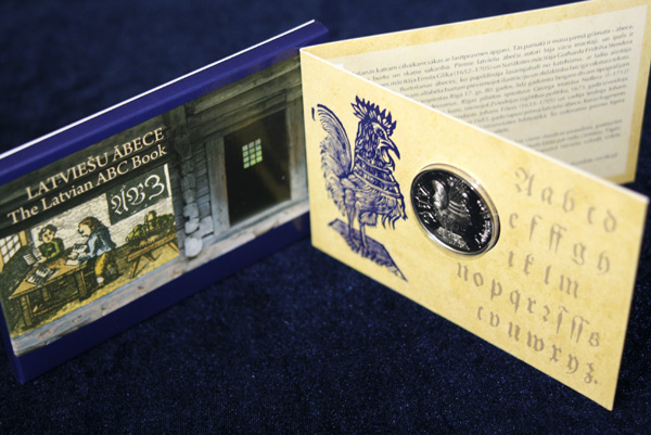 Latvijas Banka laidusi apgrozībā 1 lata piemiņas monētu “Latviešu ābece” divos kalumos: sudrabā un vara-niķeļa sakausējumā. Tās grafisko dizainu veidojis mākslinieks Arvīds Priedīte un ģipša modeli – tēlniece Ligita Franckeviča.
