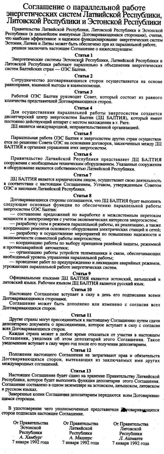Nolīgums par Igaunijas Republikas, Latvijas Republikas un Lietuvas Republikas energosistēmu paralēlu darbu (krievu valodā). Publicēts oficiālajā laikrakstā "Latvijas Vēstnesis", 12.12.2000., Nr. 448/449 https://www.vestnesis.lv/ta/id/215654