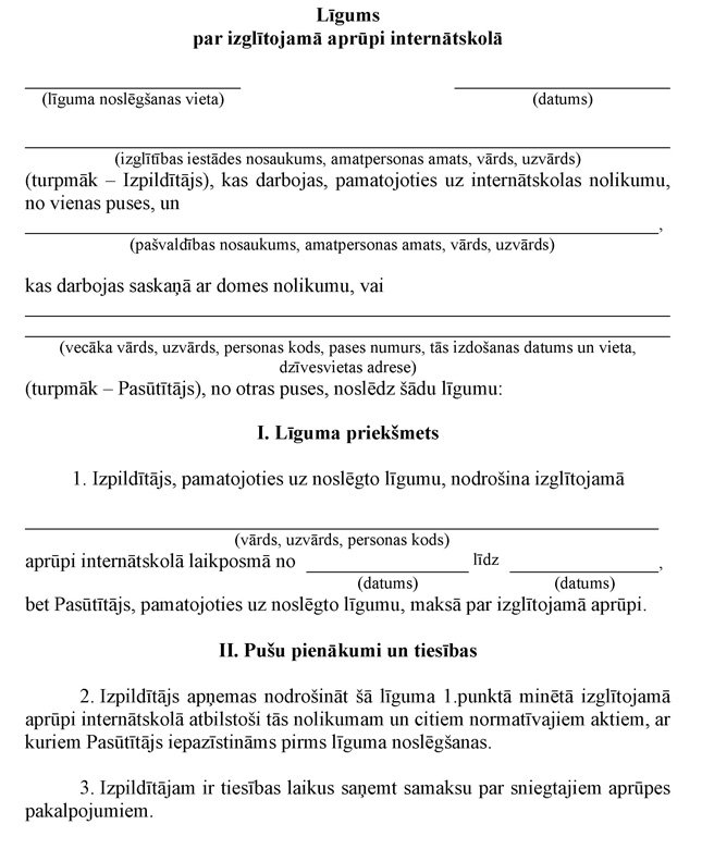 10. Maksu par šo noteikumu 9.punktā minētajiem pakalpojumiem nosaka atbilstoši faktiskajiem izdevumiem iepriekšējā mācību gadā, nepārsniedzot 185 latus mēnesī saskaņā ar šo noteikumu 1.pielikumā noteiktajiem uzturēšanas izdevumiem (gadā) vienam internātskolas izglītojamam, kas saņem internāta pakalpojumus. Maksājumus veic saskaņā ar līgumu par izglītojamā aprūpi internātskolā (2.pielikums). Izglītības iestāde slēdz ar vecākiem vai pašvaldību līgumu uz vienu mācību gadu.