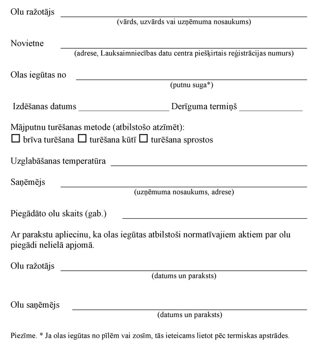 16. Piegādājot olas saimnieciskās darbības veicējam, kas nodarbojas ar mazumtirdzniecību, ražotājs sagatavo aizpildītu pavaddokumentu divos eksemplāros. Vienu eksemplāru iesniedz olu piegādes vietā saimnieciskās darbības veicējam, kas nodarbojas ar mazumtirdzniecību, otru sešus mēnešus glabā olu ražotājs un uzrāda pēc dienesta inspektora pieprasījuma.