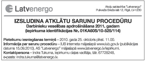 SIA “LDZ ritošā sastāva serviss” paziņo, ka 2010.gada 7.oktobrī plkst.10 notiks Kurināmā mazuta piegādes atklātais konkurss.